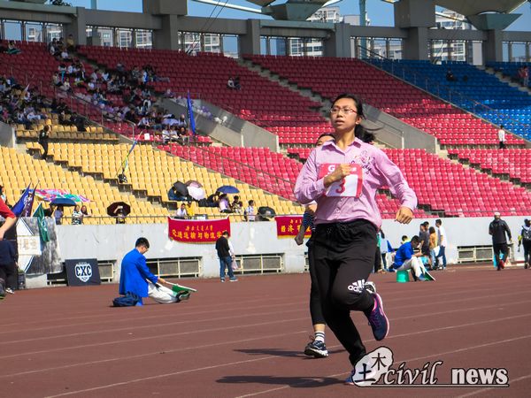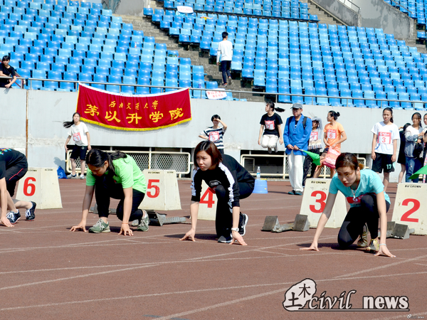 女子甲组第二小组的李文秀同学,是土木学院第一位上场比赛的选手,站在起点处的她做着热身运动,面色沉稳。发令枪一响,她便快速启动,冲向了终点线,最终取得了小组第六的不错成绩。随后上场的胡继丹、杜诗灵及米少瑄同学也均在小组内取得了好成绩。第六组的陈萱颖同学最后一个上场,并一举夺得小组第一的优异成绩。