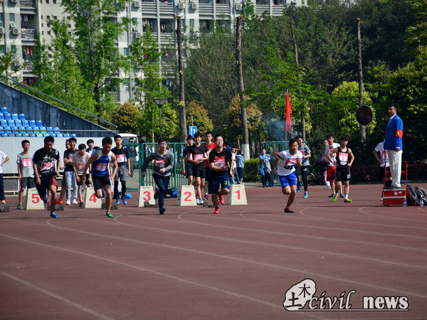 九点半左右,学生甲组男子50米比赛开始了。在火红的赛道上,他们眼神紧紧盯着前方,挥臂迈腿,引发了观众席上呐喊与欢呼的热浪。裁判组的同学、老师们都认真地盯着终点线,不敢放松,以保证比赛的公允与裁断的准确。土木学院的樊浩田、黄文峰、卢剑波都在各自小组取得了第二名的好成绩;李雨轩与王兴平同学也在小组比赛中表现抢眼。