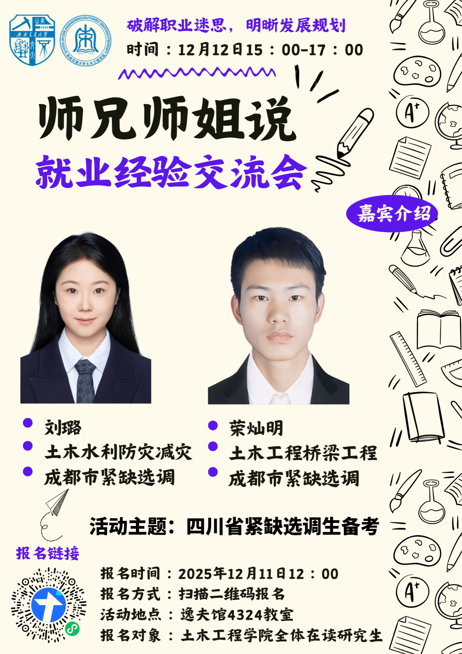 本期活动聚焦“四川省紧缺选调”,邀请两位已成功上岸的师兄师姐,围绕备考策略、面试心得与职业体会展开真诚分享,助力同学们在面临“深造或就业”“体制内外”“城市选择”等重要抉择时,能够更清醒地规划未来、更从容地迈向职场。